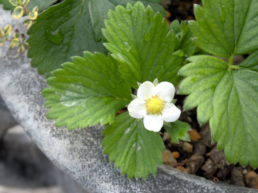 昨年11月に植えた白イチゴの「天使のいちごAE(エンジェルエイト)」のお花が咲きました。まだ株が大きくなっていないので、実にならないかもしれませんが咲いてくれて一安心です。
