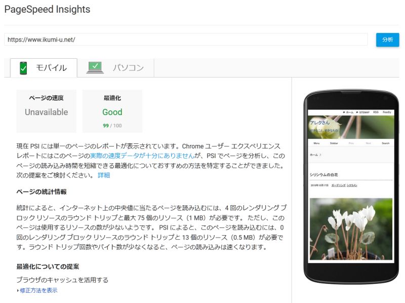 これで PageSpeed Insights のスコアが驚きの 99 に! 試しに TestMySite でモバイル表示テストをしたら、なんと2秒という結果に! 2秒なんて初めて見たよ……