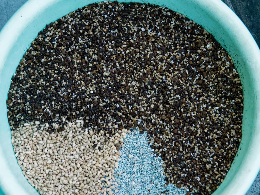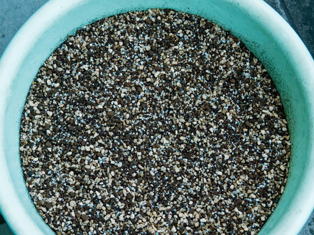混ぜるとこんな感じになります。日光砂のおかげで多少明るくなる感じですが、水はけが良い割に水切れしにくい土になっていると思っています。チベタヌスの場合は特に春から初夏にかけて水切れしやすく、一度でも水切れすると枯れてしまうことが多いです。
