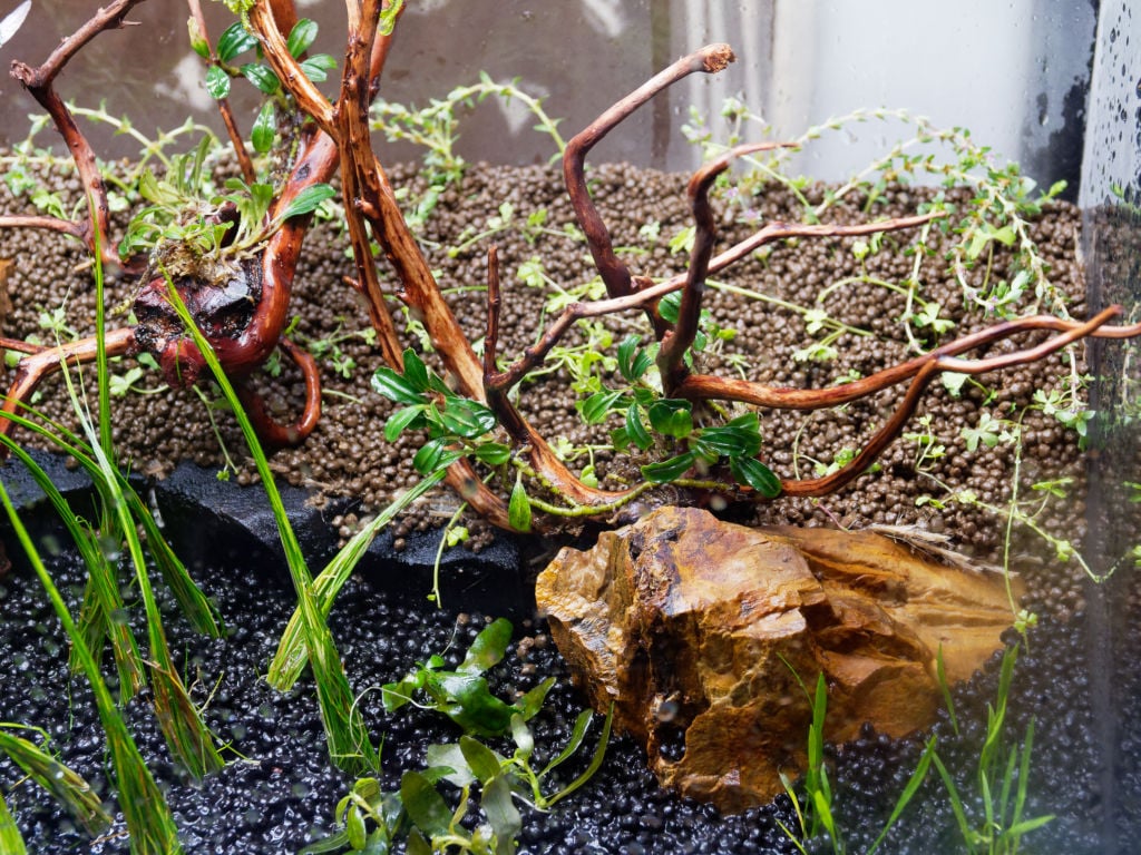 右奥の水槽壁面にロターラ・ナンセアンの水上葉を植えました。後景草として頑張って欲しいです。それからブランチ流木にブセファランドラの Melawi Mini を水草グルーで付けたものを、手前の前景に右からテネルス、ストロギネ sp. パープル、ショートヘアグラスを植えました。