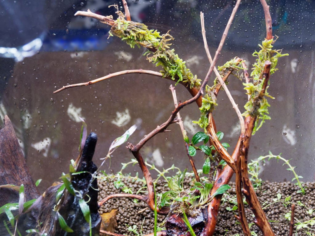 今回は水深を浅めの水槽にしようと思い、ブランチ流木の先の方にハイゴケを付けました。ハイゴケは水中化しないコケと言われていますので、少しずつ水深を上げていって先端あたりに残って欲しいと思います。光量があれば多少は適応するらしいです。