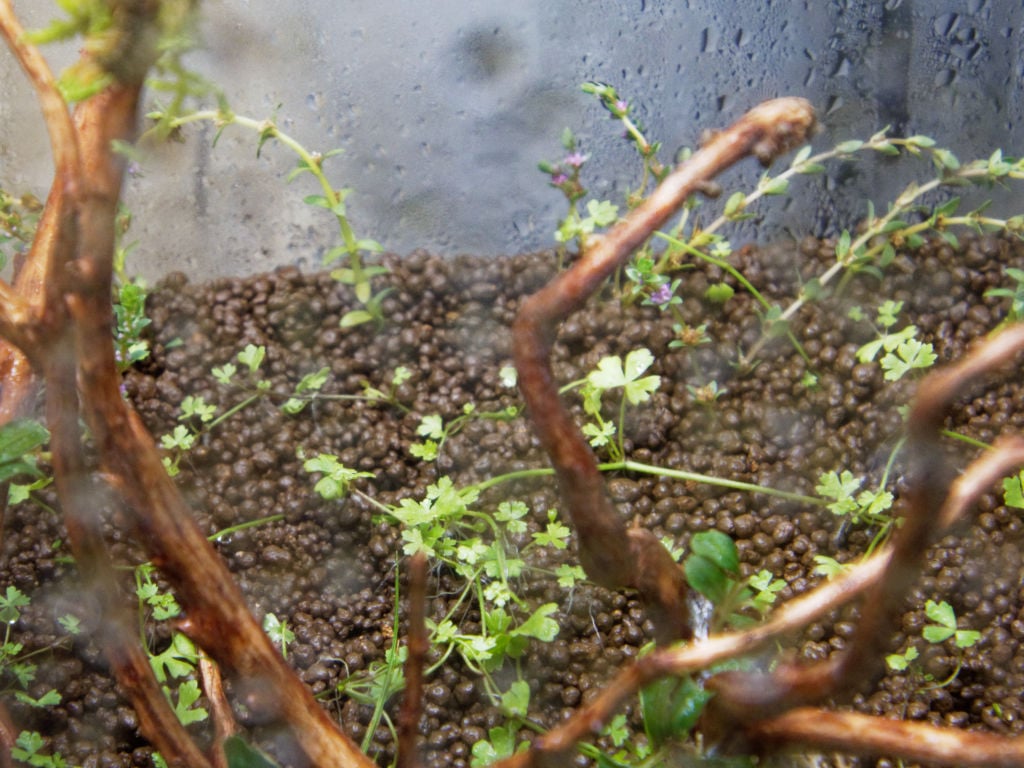オークロことオーストラリアン・ヒドロコタイルは、節々から小さな葉を展開し始めました。やはりこちらのソイルも肥料分がほとんどないので、こちらにも少しイニシャルスティックを差し込みました。ソイルの厚さが薄いためあまり効果はないかもしれませんが。淺緑色の絨毯になってくれるのを期待しています。