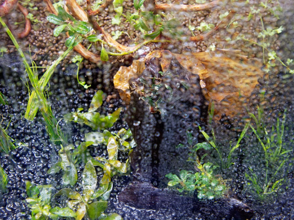 テネルスとの間にスペースを空けていたのは、このブセファランドラ付きの小さい流木を置くためでした。Brownie Phantom(ブラウニーファントム)という小型の種類で、水中葉は藍色に輝くとか。実は下の方の株がそれで、流木の上には同じ名前で来ていたけど見た目が違うブセを付けています。