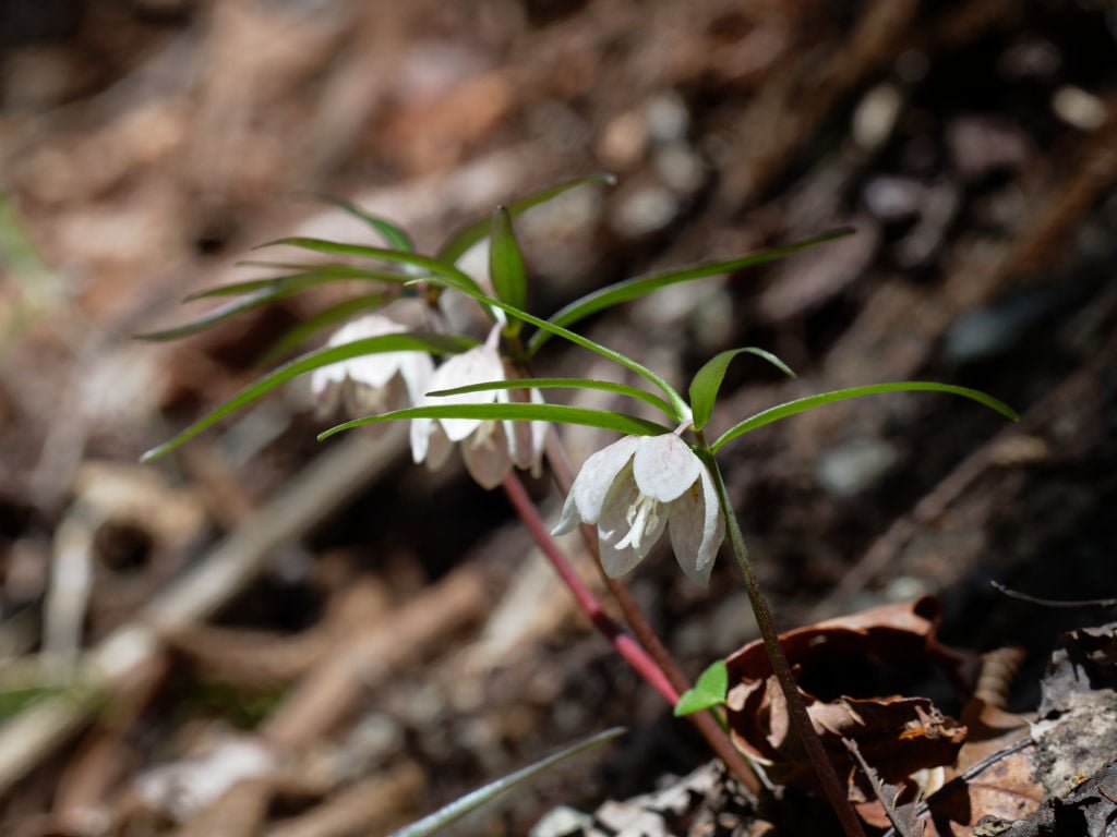 下山も後半でそろそろ車を駐めた場所が見えてくるだろうと考えていた時、獣道にしては妙にはっきりした踏み跡が気になりました。先の方に緑の新芽が見えましたがユキザサのようです。父に少し待ってもらいその先まで足を伸ばしてふと上を見上げたら……ありました! 待望の咲いているカイコバイモでした。
