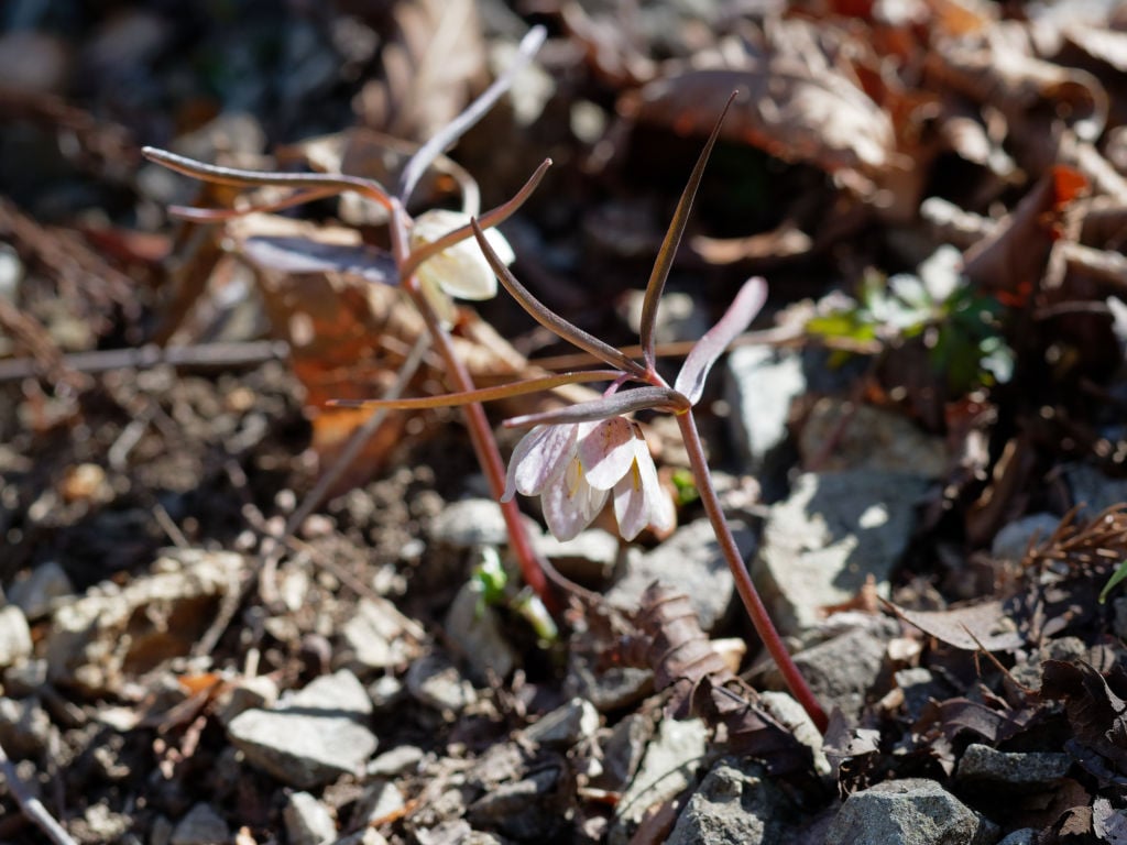 カイコバイモ(Fritillaria kaiensis)は東京、山梨、静岡の三県だけに分布する珍しいコバイモです。分布すると言っても局所分布なので、花の時期に自生条件に合った山林を探せば見つかるという花ではありません。確実に自生地を知った上で、短い開花期間に合わせて訪れないと出会えない花です。