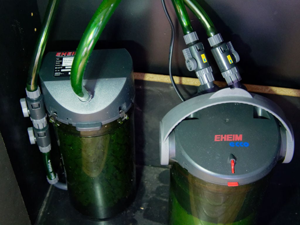 フィルターはサブフィルターを追加してダブル濾過槽にしました。左がエーハイムサブフィルター2213、右がエーハイムエコフィルター2234です。エコの呼び水機能でサブを経由して取り込めるか不安でしたが、サイフォンの原理は当たり前のように二つの濾過槽を満水にしてくれました。地球すごい。
