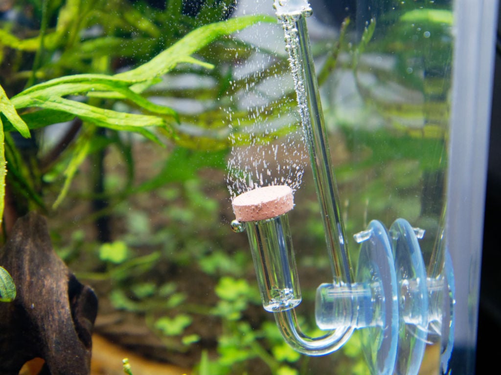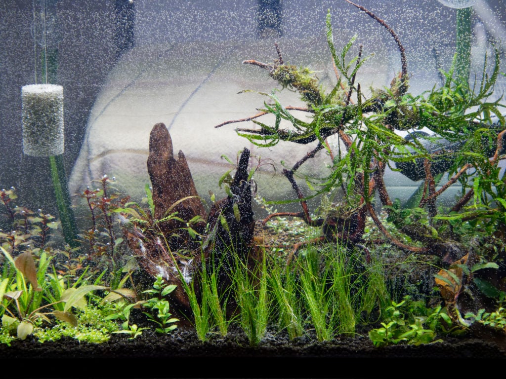 WaterPlantsWorld さんのシステムは、本来はフィルターのホースに繋げる強制添加システムなのですが、久しぶりの水草水槽なので CO2 の泡を見たいのと何かと話題のアンビリーバブルというのを使ってみたかったので、これで添加しています。一秒一滴の時の泡の出方ですが、うわさの通りなかなかに細かくて良さそうな泡です。