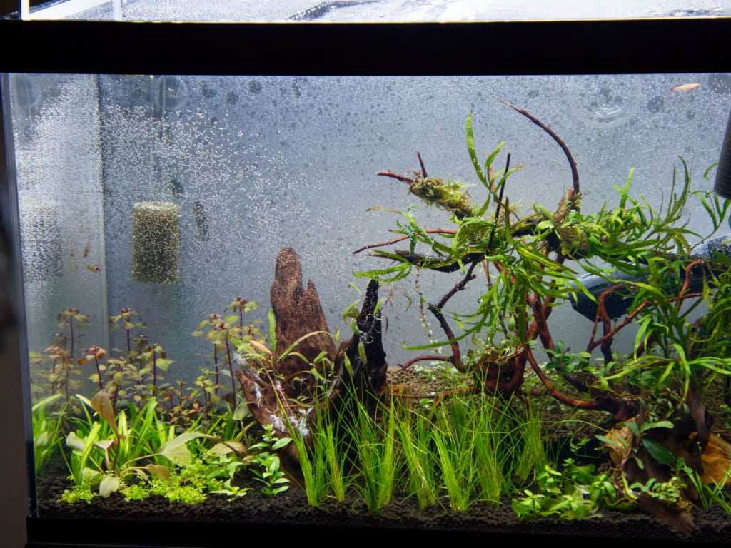 ミスト式での水槽立ち上げから4週間が経ちました。まだ早い感じもしますが、水槽手前のソイル際にラン藻が出始めたので、ここらで注水します。ニューパールグラスを始めルドウィジアもヘアーグラスも根っこは張っているようなので、これ以上待たなくても良さそうです。