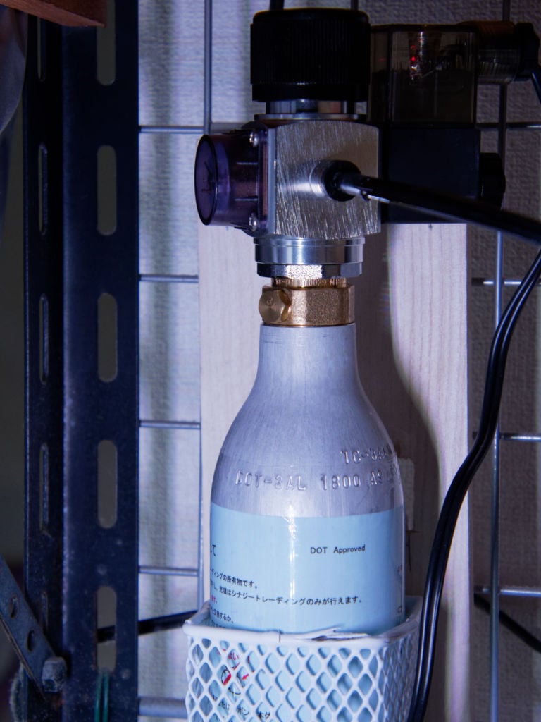 CO2 添加システムは WaterPlantsWorld さんの「MR-651S型ボンベ用フルセット 12mmホース用」を使いました。電磁弁付きのレギュレーター、低流量スピコン、逆流防止弁付きカウンターなどがセットになった使いやすいシステムです。S型ボンベというのは、ソーダメーカーなどの炭酸水を作る家電商品用のボンベで、汎用の小型ボンベより大容量だけどミドボンほどは大きくないものです。