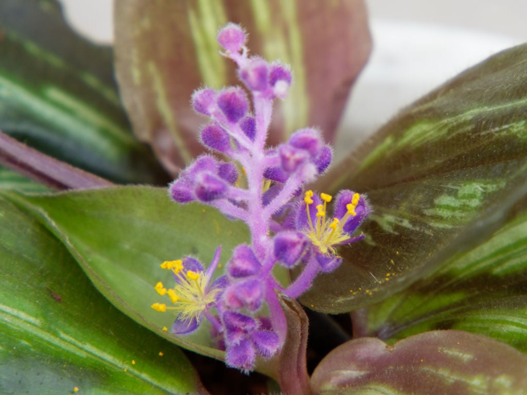 葉模様の美しさから気に入って育てていたものですが、花が咲いてみるとこれまた瑠璃色で可愛らしい花です。黄色いおしべがコントラスト良く、なかなか見栄えのする花に思えます。もう一回りか二回り大きな花になれば……とも思いますが、十分に成長すれば枝分かれしたボリュームのある花茎を付けてくれるように思うので、これからに期待します。