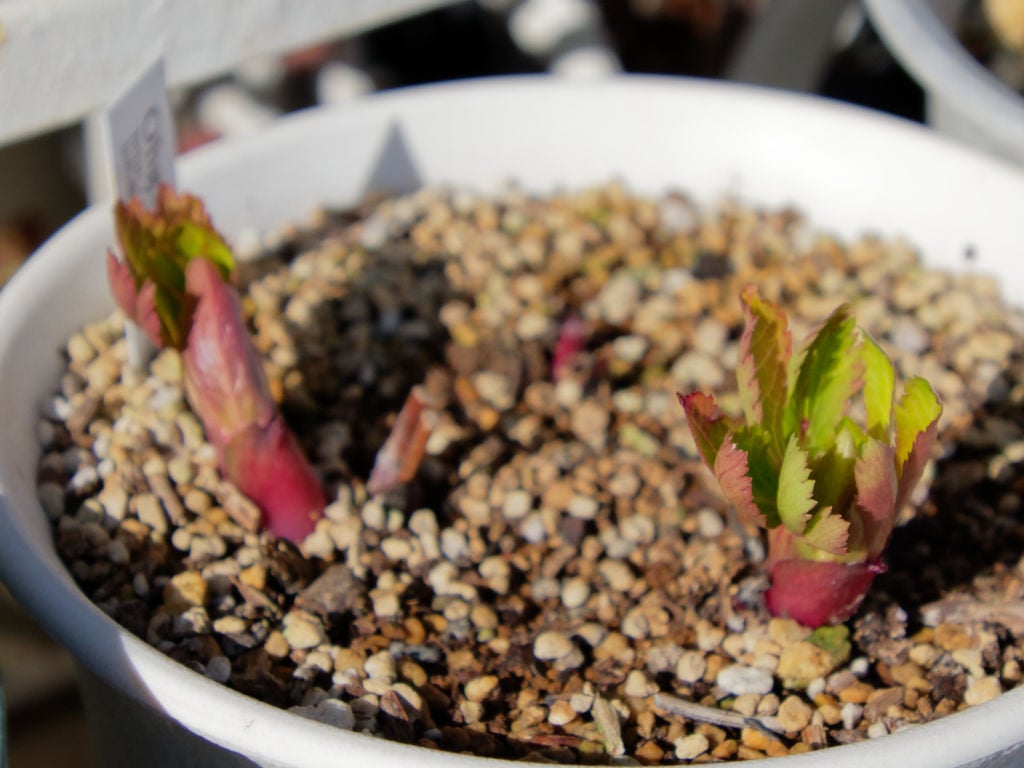 こちらは大木さんの小輪オーレアで、いつもは早く咲いてくるのですが今年はデュメトルムと同じくらいか少し遅い? 感じで育っています。寒さが十分でないから調子が狂ったのかな? 落葉して休眠する宿根草や球根にもいえますが、一定の寒さに遭わないと休眠が覚めないことがあります。暖冬とはいえクリスマスローズには十分な低温があったんじゃないかと思いますが、いつもとは違っていたのかもしれません。