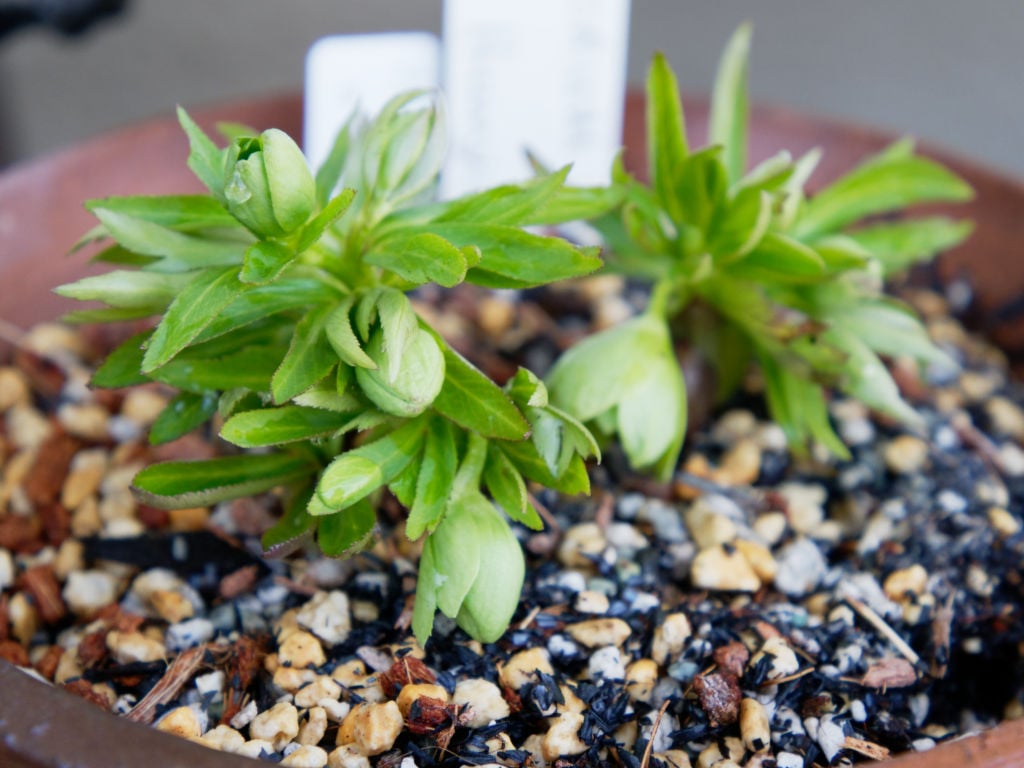 ようやくデュメトルム・ダブルが咲きました。右の花茎の一番花が開いています。こんなに低い位置で咲いているので、お花を持ち上げないと中の様子が分かりません。この株は昨年植え替えていないので、表土を2cmくらい取り除いて地際を清潔な用土に交換します。