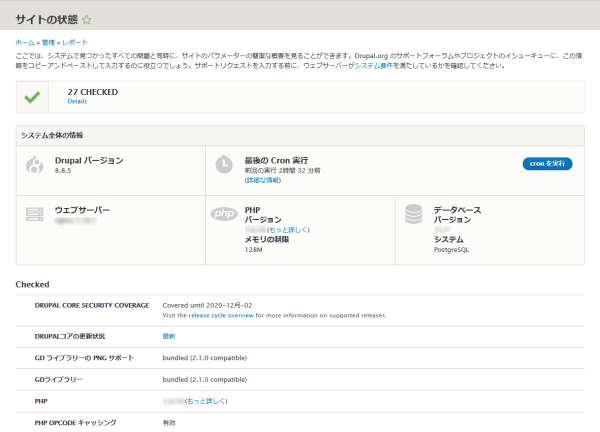 Drupalにはサーバーの情報をまとめて見せてくれる「サイトの状態」というページがあります。Drupalを構成している本体、Webサーバー、PHP、DBのバージョンなどを表示するだけでなく、それぞれのモジュールの更新状況や、必要な場合には更新のためのリンクも表示してくれるので、サーバーアプリを最新の状態に保つにはとても便利な機能です。