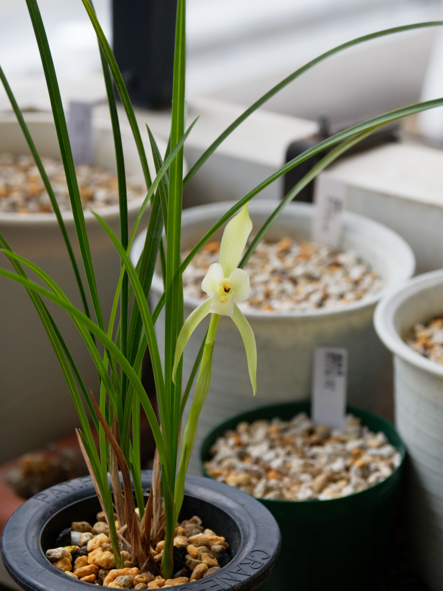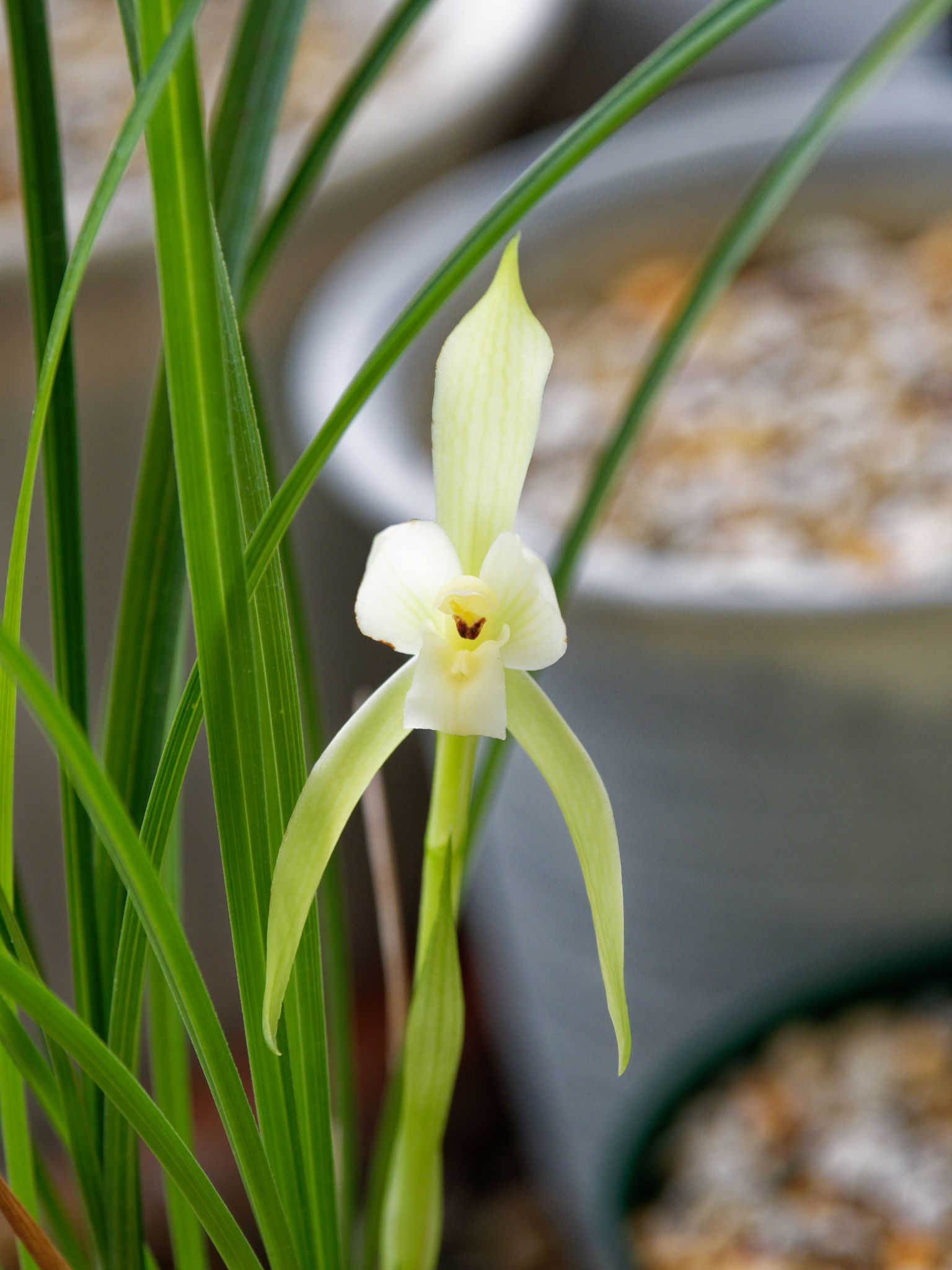中国の蘭は一花と九花という分け方があって、一つの花茎に花が一つ咲くものと、複数咲くものを厳密に分けています。写真の花は雪蘭という一花蘭で、中国奥地蘭と呼ばれる比較的新しい分野の蘭です。白花といわれる素心の品種で、「白雲」という名が付いています。これもまた良い香りのする蘭で、一花の代表格である中国春蘭とは少し違った香りです。