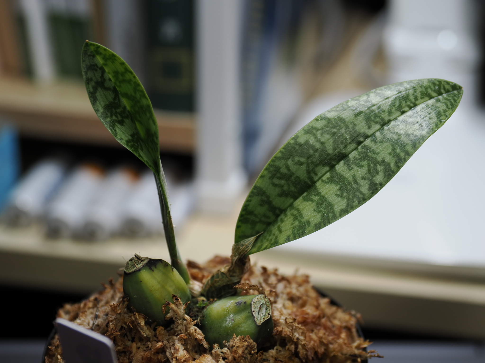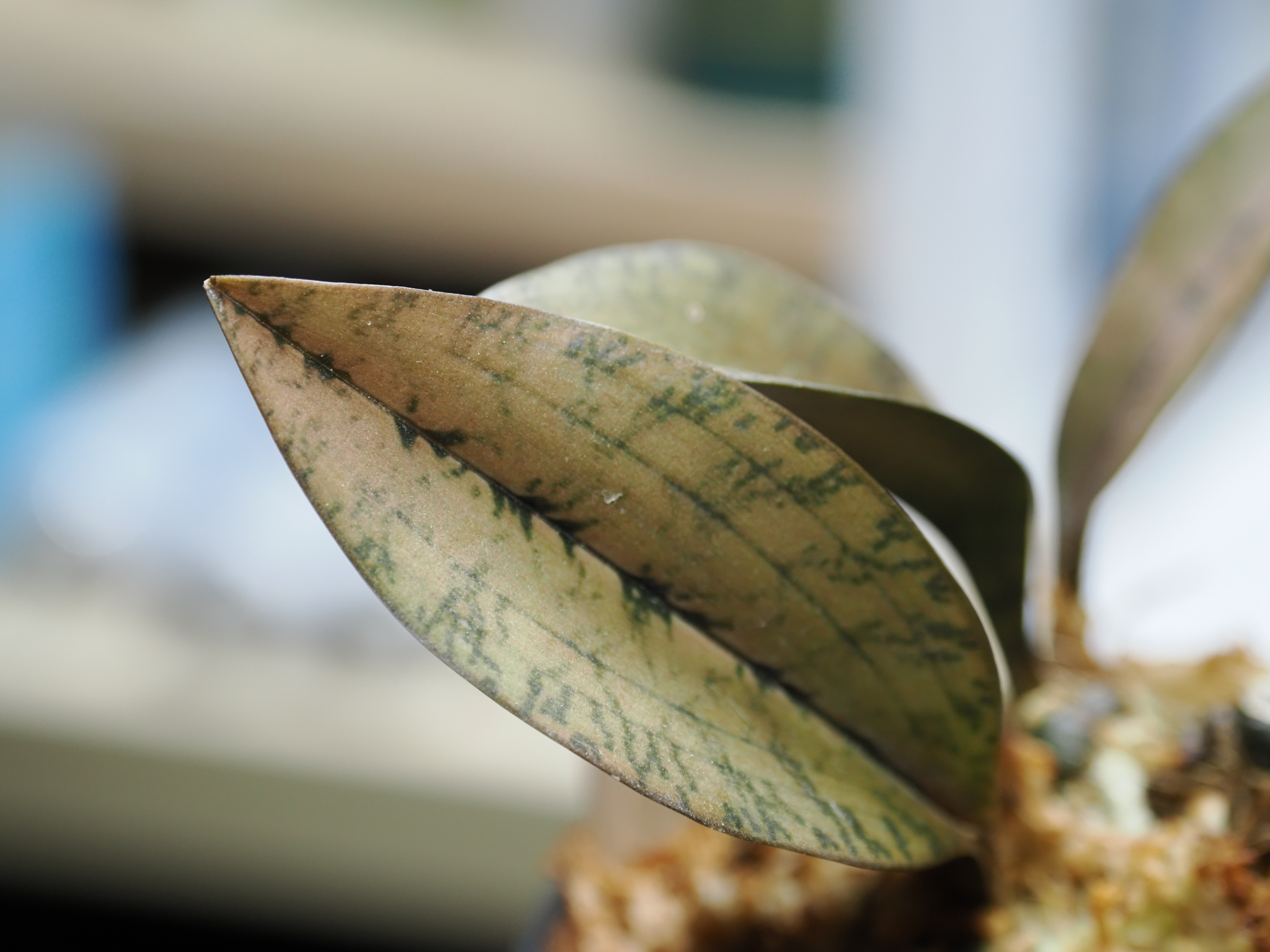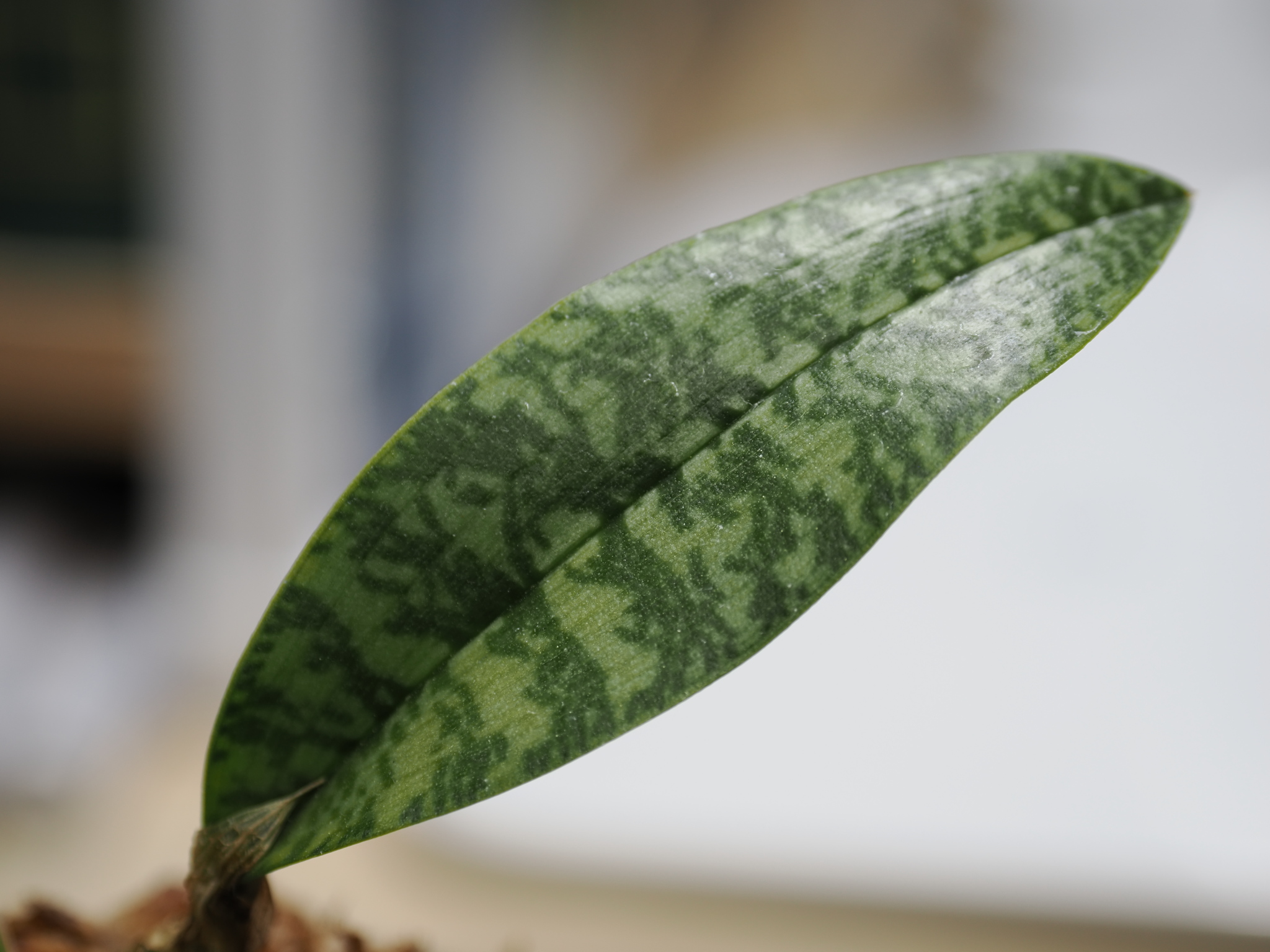 マキュラータ種です。かなり大きな葉をつける種類なので、まだまだ小苗と言った感じでしょうか。左の新芽が伸びている途中の状態で、折りたたまれた葉が先の方から開いていく様子がよく分かると思います。薄い緑色の地色に濃い緑で不規則な模様が入ります。パフィオペディルムの葉に似ていると思いました。