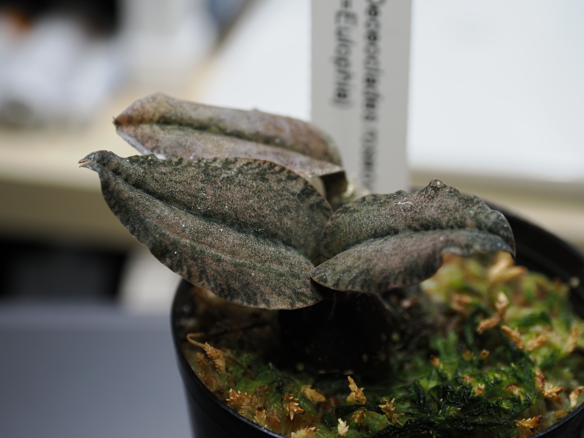 葉の縁がゆるく波打つのが特徴で、主脈も深く溝のようになっています。表面にはラメのように細かな凹凸があって、光の当て方でキラキラして見えるのはジュエルオーキッドと呼ばれるこの仲間の特徴でもあります。色合いは好き好きかもしれませんが、自分は少し苦手な感じで爬虫類や両生類の皮膚のように見えてしまいます。そこがいいんだろう? って怒られそうですね。