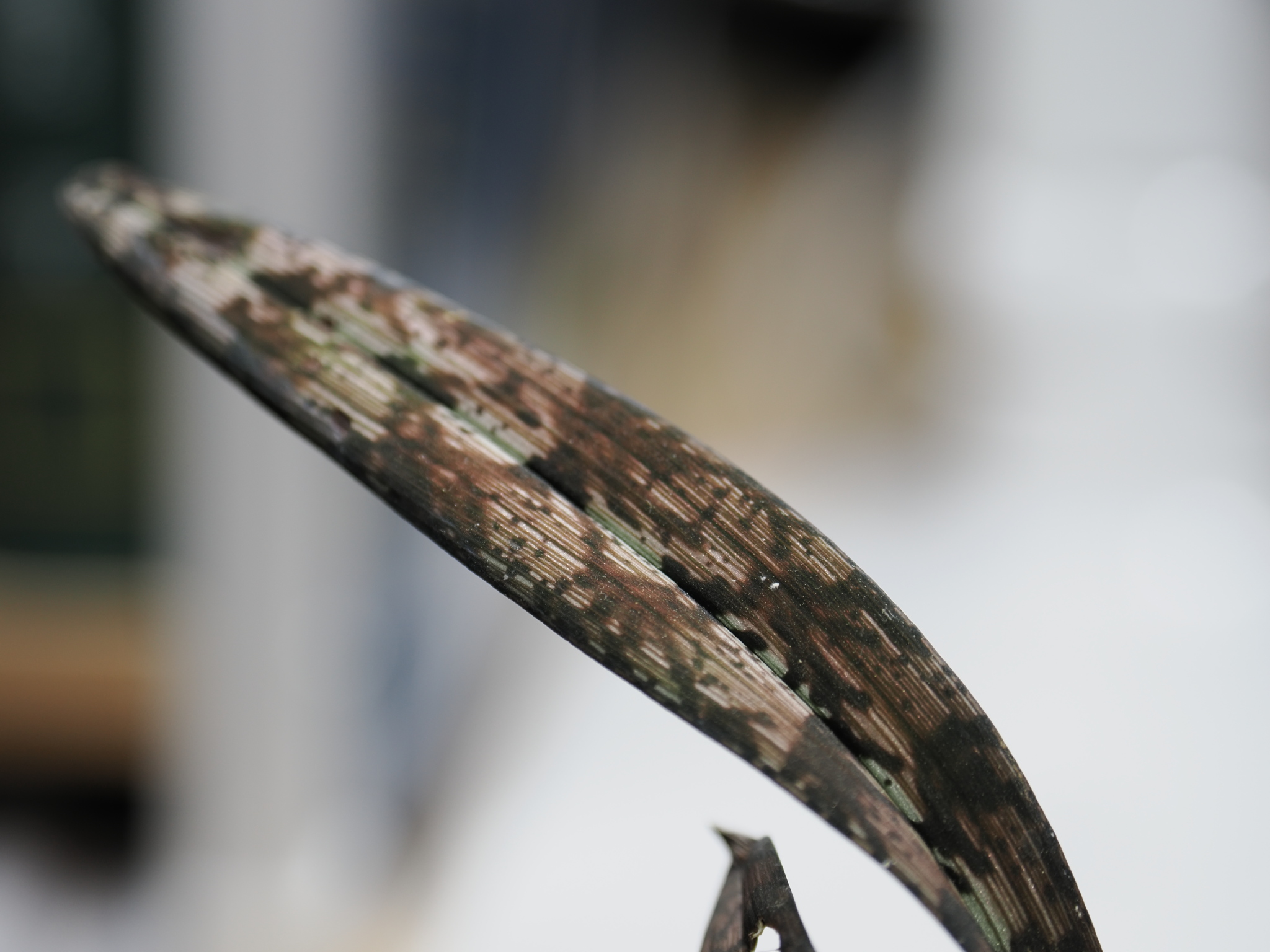 主脈に沿うように抹茶のような色の模様があります。側脈にも薄く滲むような緑の模様が入るので、本当に枯れ葉と言われればそのまま信じてしまいそうです。自生地では林床の落ち葉の中から葉だけを覗かせるように生えているらしく、一種の擬態と考えられているそうです。