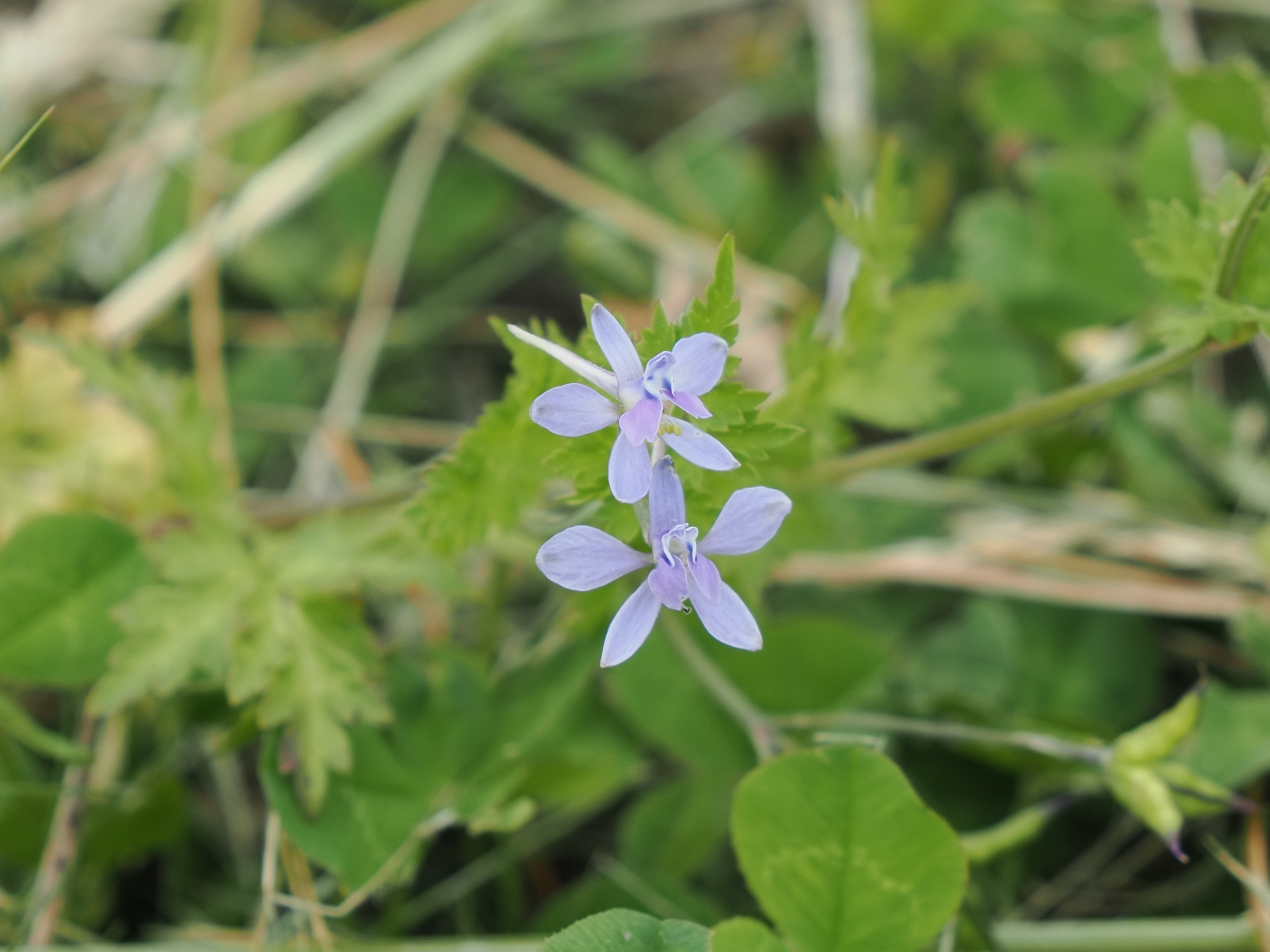 一年性のデルフィニウムです。デルフィニウムというより、チドリソウと言ったほうが花が似ていると思いますが、今の分類だとチドリソウは一年性のデルフィニウムという扱いなので、この種も同様に分類されているという事でしょう。日本にはデルフィニウムの自生種がありません。その点でも遺伝子汚染が起こる心配がないので、外来種ですがあまり心配は要らないと思う次第です。
