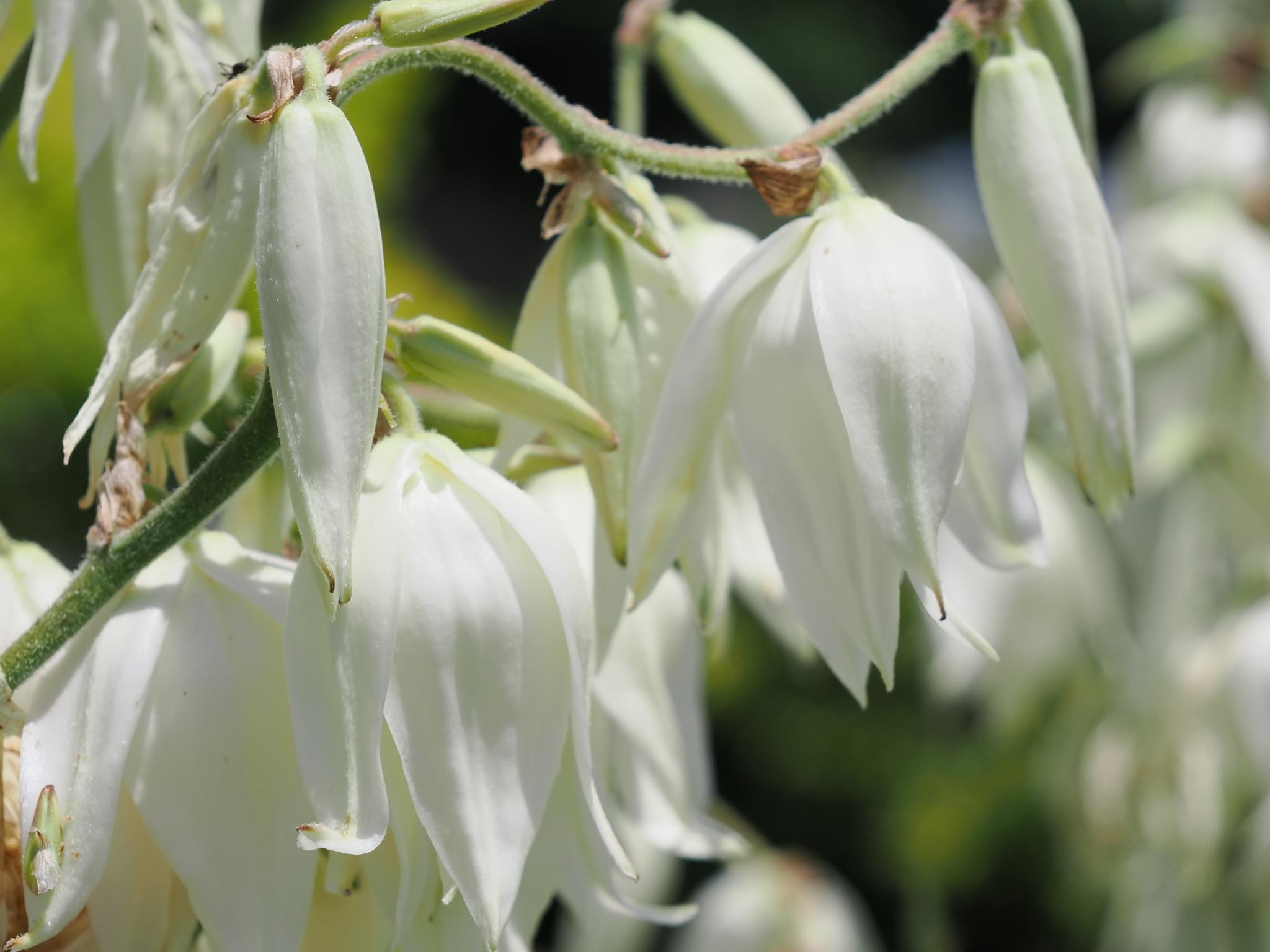 リュウゼツラン科の植物なので、ユリと同じように外花被片と内花被片が三枚ずつで構成されています。花の奥には甘い蜜があるので、ミツバチやアリが集まっているのを見掛けます。温暖な地域で街路樹にも植えられているキミガヨランに比べると、少しほっそりしてあまり開かない印象です。