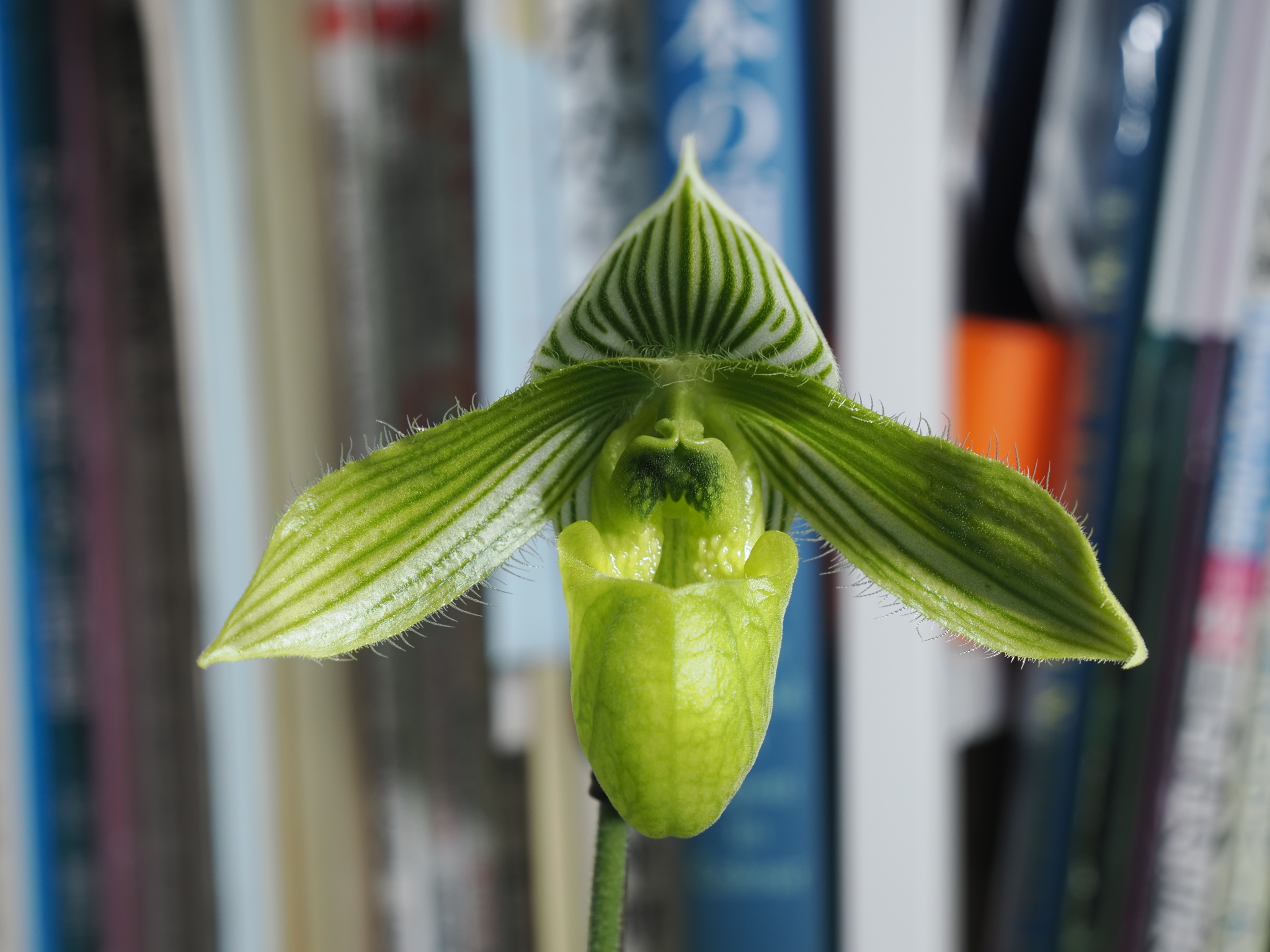 花粉親に良く似た感じのストライプがはっきりした花になりました。抹茶のように濃い緑色と、白色部分のコントラストがなかなか良さげです。自分はパフィオの花の優劣は不勉強なので、どちらに似た方が良かったのかとか、どの部分が良くて、どこが良くないかなどは詳しく分かりません。