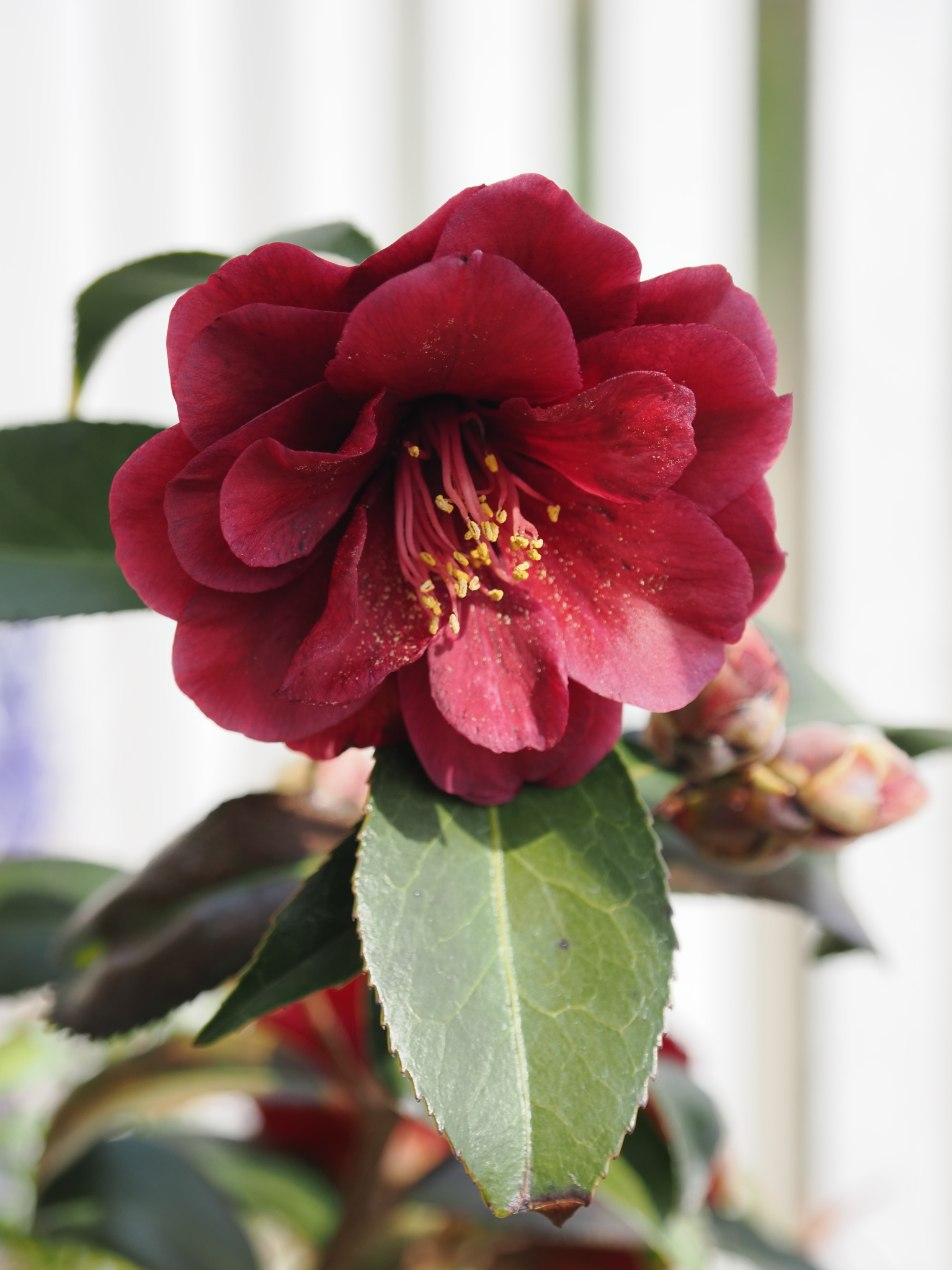 昨年秋遅くにホームセンターで売れ残りの鉢苗を購入した暗赤色の花を咲かせる椿です。江戸時代から知られる古い品種で、八重咲きの中輪花品種です。クロツバキ、と呼ばれる品種はいくつか存在していて、オーストラリアでこの品種の実生から誕生した「ナイトライダー」や、黒侘助といった品種が一般に知られています。