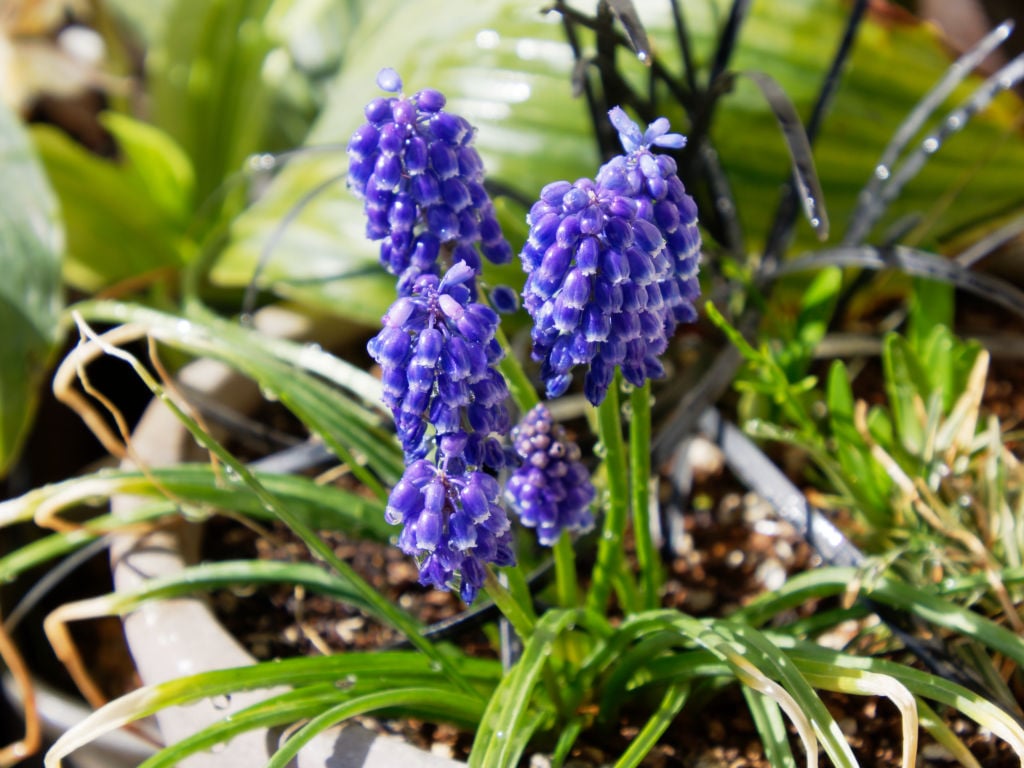 春先に作った、青い花だけの寄せ植えがあります。その中でムスカリの「ブリンブリン」という面白い名前の品種が咲いてきました。ブドウムスカリの品種らしいのですが、ワックスで磨いたみたいにツヤツヤして光沢があるきれいな花を咲かせます。