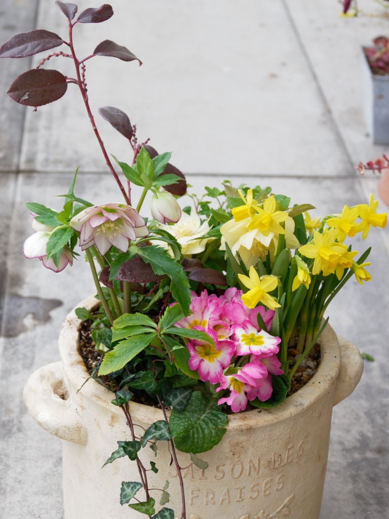関東に寒波がやってきた連休初日に、クリスマスローズを中心にした早春の寄せ植えを作りました。雪の予報も出ていて心配していましたがあまり気温も下がらず、風のない曇りの一日になりましたので寄せ植え作りには良かったと思います。