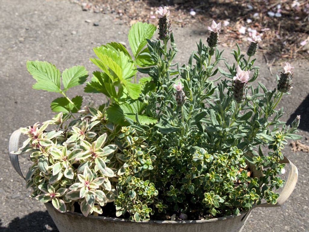 植えてから一週間ちょっと経った状態です。イチゴの葉が増えて、金魚草につぼみが見えています。レモンタイムとフレンチラベンダーも、枝が落ち着いて自然な感じになりました。