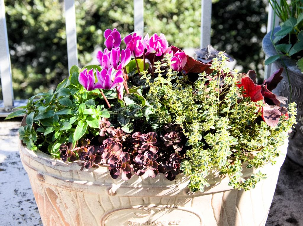 カラーリーフ主体の冬の寄せ植え第二弾です。今年は色々なガーデンシクラメンを見掛けましたので、積極的に使っています。中央にティアニスというガーデンシクラメンを。刷毛目の縁取りになって可愛いシクラメンです。花付きも良くておすすめです。