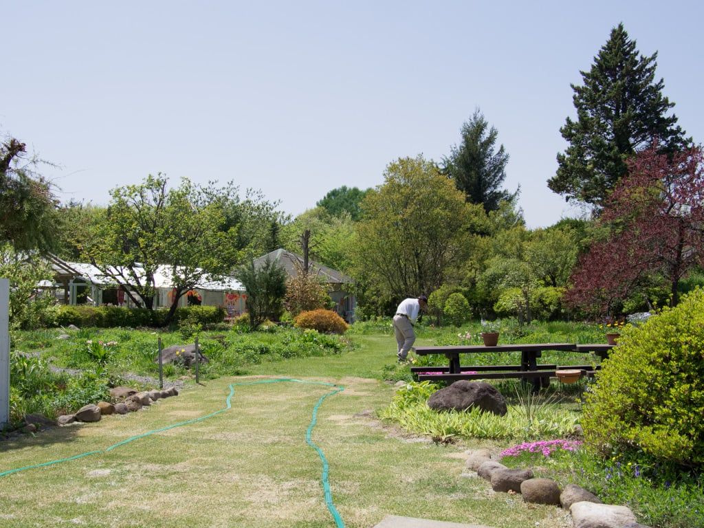 日野春ハーブガーデンの後は、そのまま小淵沢に向かって「ペレニアルガーデンショップ ABABA」さんへやって来ました。ガーデンの入り口は芝生の散水チューブ? らしきものと、ここのガーデナー小黒さんのお姿が。