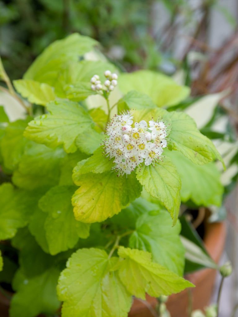テマリシモツケの黄金葉品種、ルテアが咲きました。テマリシモツケというと、銅葉の品種がいろいろと売られていて、ディアボロが有名だと思います。基本種のお花は、咲き始めでも中心が少しピンクになります。ディアボロだと全体がほんのり桜色になりますね。