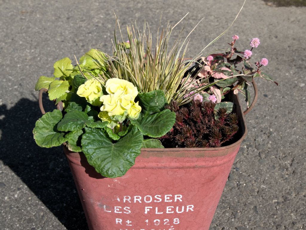 雪が降るまで楽しめればいいなと、寒さに強い宿根草を中心に冬の寄せ植えを作りました。中央にはフリンジ咲きのガーデンシクラメン、手前左からビオラ・ソルベXPイエロージャンプアップ、セダム・スプリウム・トリカラー、ラミウム・ヘルマンズプライドです。