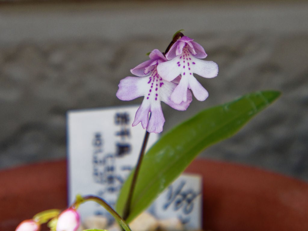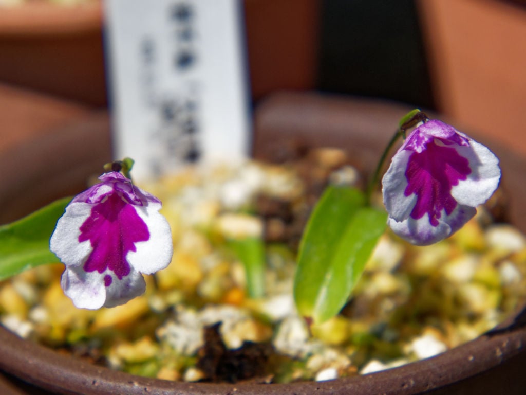 これは岩千鳥の「剣(つるぎ)」という品種で、日本イワチドリ愛好会登録No.287です。日本イワチドリ愛好会は、関西ウチョウラン保存会とともに、昔からイワチドリの品種を登録・保存管理していた団体です。解散してしまったのは残念です。