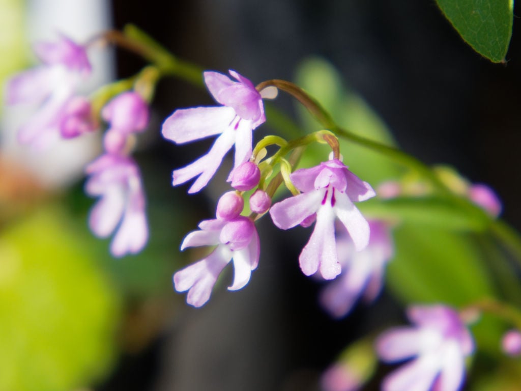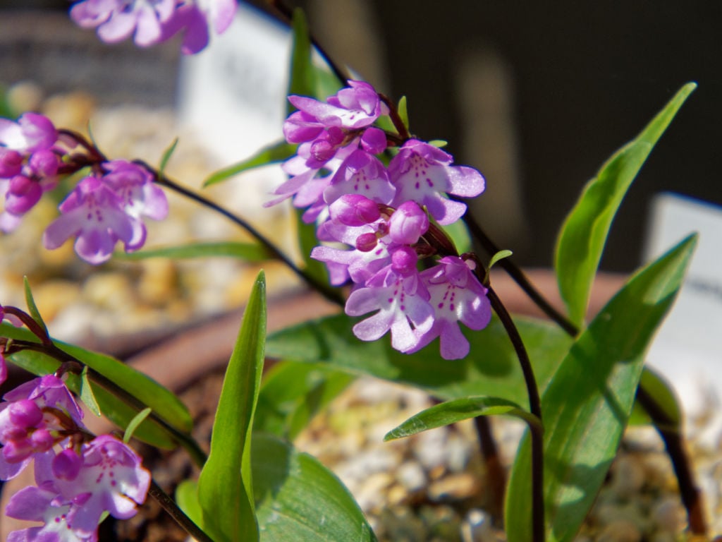 この写真の花がエノモトチドリで、これは濃色で花形の良いものから選ばれた「紫宝」という品種です。花の大きさはイワチドリより少し小さくて、唇弁が全体的にほっそりとしてコアニチドリの特徴を受け継いでいるように見えます。