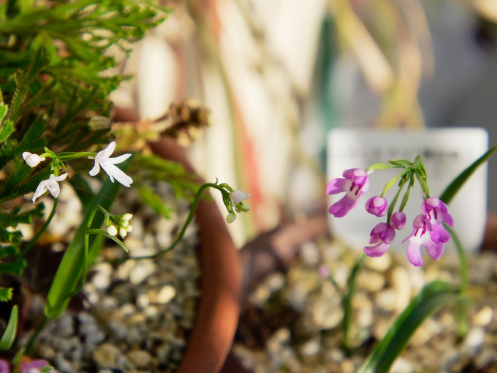一緒に写っているコアニチドリも、側萼片が長く開いた咲き方をしています。自分が子供の頃に見ていたタイプとはちょっと違うようなので、産地違いか実生による変異なのかもしれません。コアニチドリは花が終わると茎頂にムカゴを付けて増殖する性質があります。