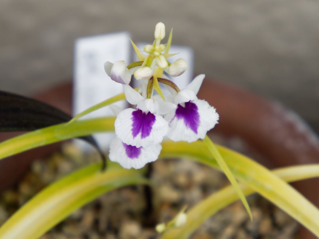 紫点の入り方に特徴があるのと、舌が丸くなっているのがウサギを思わせて可愛いです。思わず「アンゴラ?」と思ってしまいました。イワチドリにもありますが、白地で丸い花はウサギっぽい感じがします。隣にカラス葉のウチョウランが置いてあるので、両方咲いたら一緒に撮影して比べてみたいです。