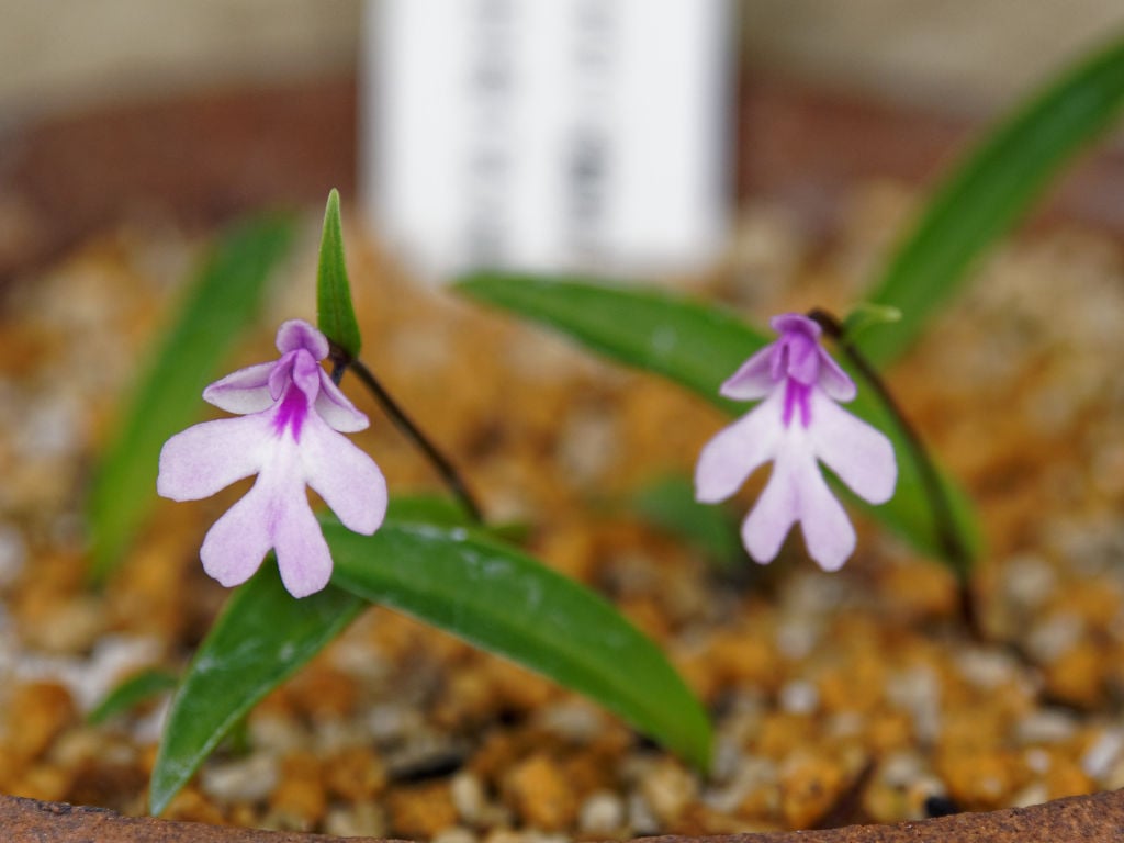 アップで見るとコアニチドリのようですが、花の大きさがイワチドリと同じくらいあります。エノモトチドリの白紫点花です。エノモトチドリはイワチドリとコアニチドリの交雑種で、両種の中間のような花になるものが多く、昔流通していたものは大体そうでした。