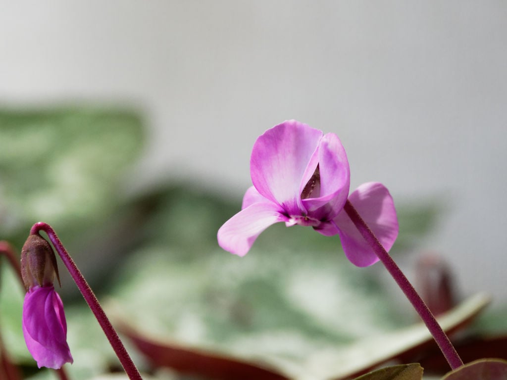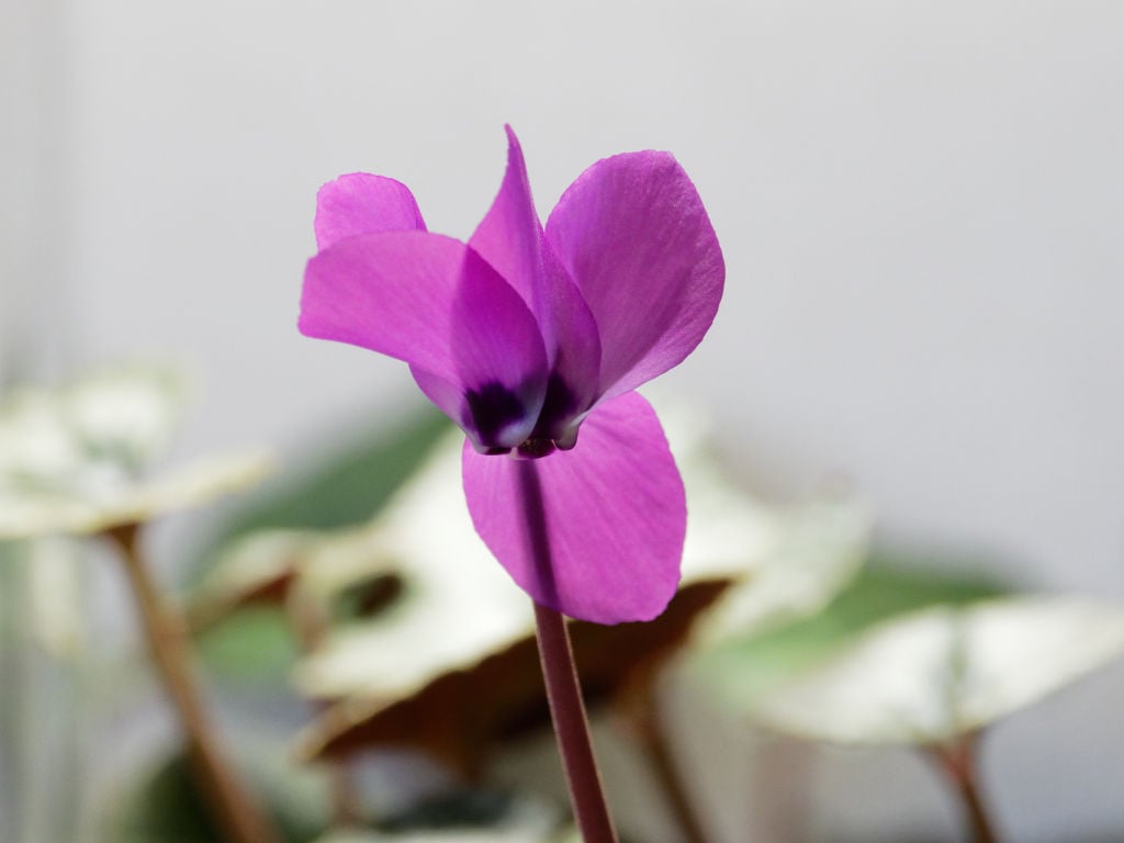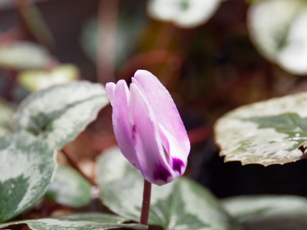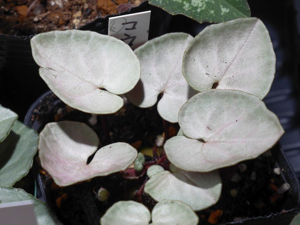 「花工房たんぽぽ」さんから購入した、プラチナリーフにピンク色が乗る珍しいコウムです。シルバー、プラチナと金属光沢を持つ葉の表現がありますが、シルバーより白っぽい? ものがプラチナリーフと思っています。園芸品種の「アフロディーテ」という優しいピンク色のシクラメンがありますが、その品種の葉色がプラチナリーフと呼ばれたのが広まったようです。