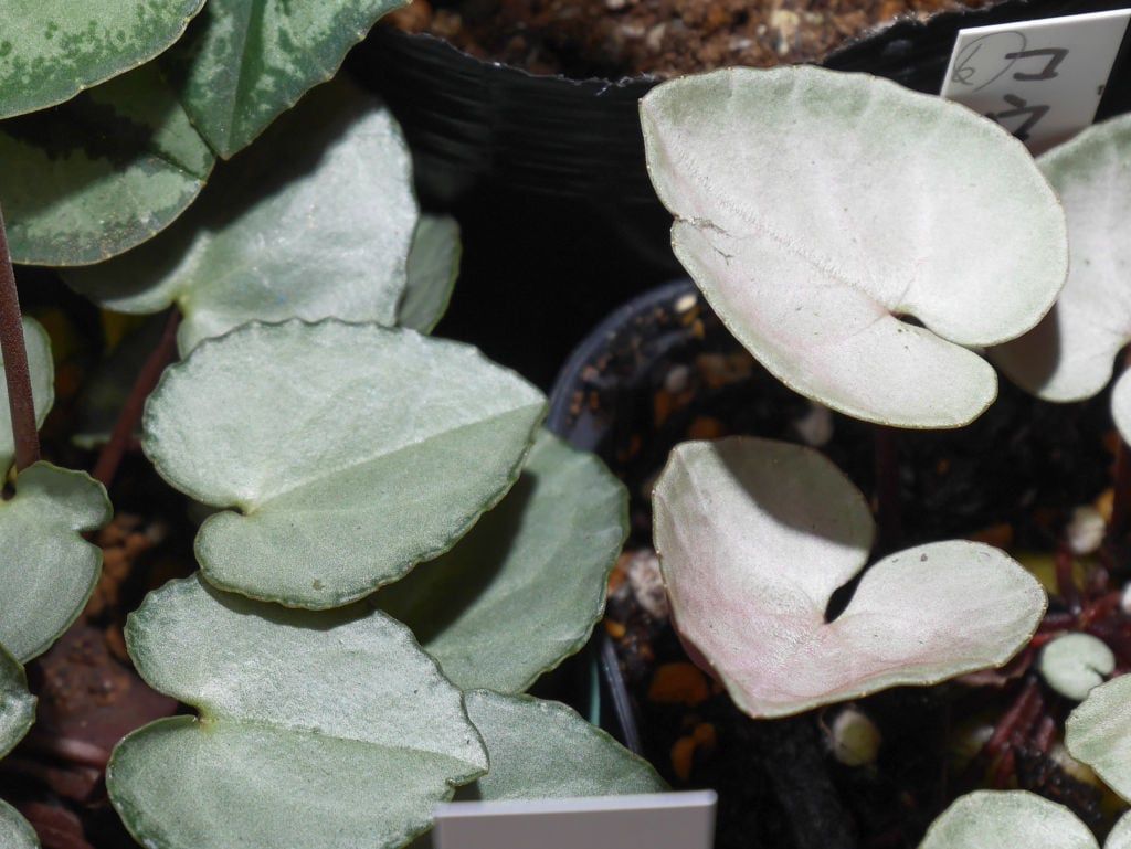 「花工房たんぽぽ」さんから購入した、プラチナリーフにピンク色が乗る珍しいコウムです。シルバー、プラチナと金属光沢を持つ葉の表現がありますが、シルバーより白っぽい? ものがプラチナリーフと思っています。園芸品種の「アフロディーテ」という優しいピンク色のシクラメンがありますが、その品種の葉色がプラチナリーフと呼ばれたのが広まったようです。