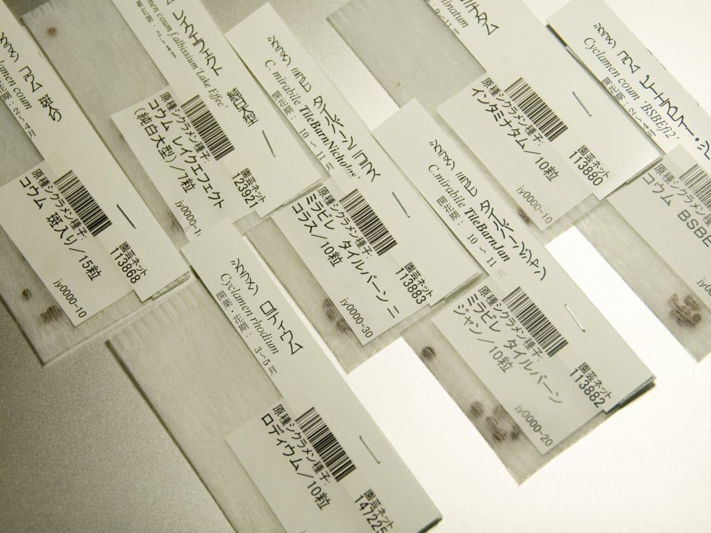 昨日の予告の通り、丸一日以上吸水させたシクラメンのタネをまきました。左上から上段はタイルバーン・ニコラス、インタミナタム、コウムBSBEf2、下段はコウム・レイクエフェクト、コウム斑入り、札の付いていないのはヘデリフォリウムです。