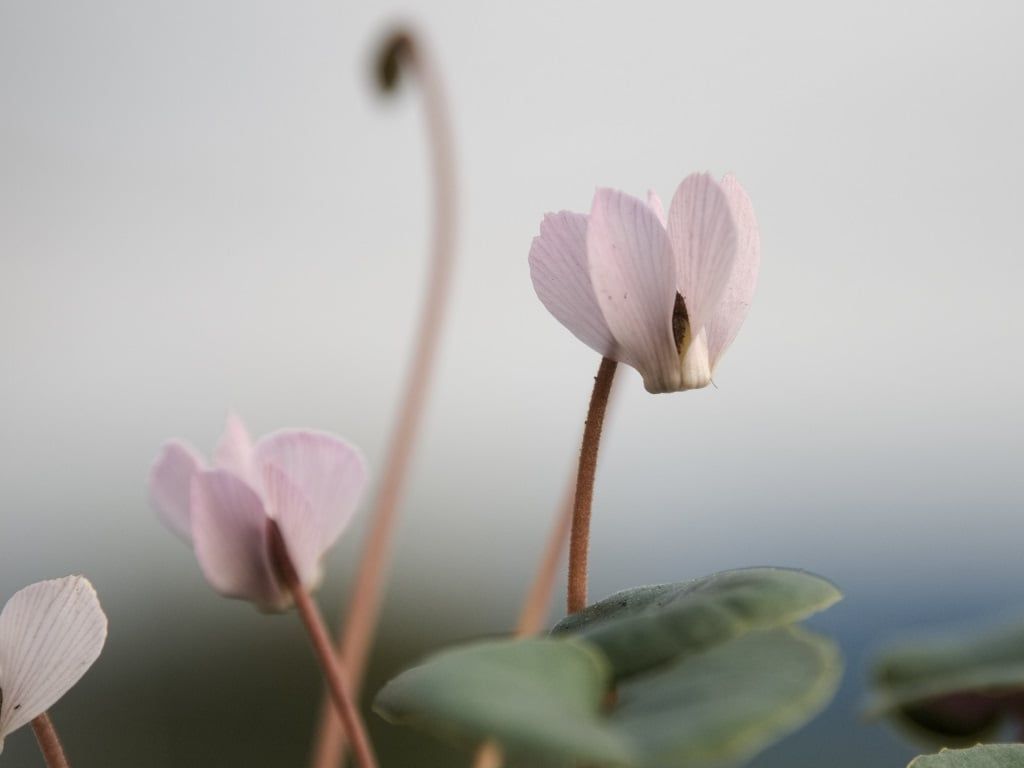 お花のサイズは1cmあるかないかで、ミラビレの半分ほどです。原種というよりミニチュアシクラメンと言いたくなります。それでも気品のある姿と花びらに薄く入るストライプ模様は独特で、人気のある原種なのがよく分かりました。