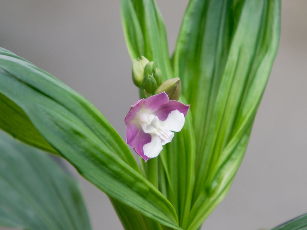 苗なので外は寒かろうと、原種シクラメンのそばに置いて育てていたら、ずいぶんしっかりした太い芽が伸びてきました。しかも開き始めた葉の間の奥の方に、つぼみらしき緑の塊も見えました。あれ? 早くて来年なんだよね……見間違いかな? と思いながらも期待しているとゆっくり成長して昨晩開き始めました。