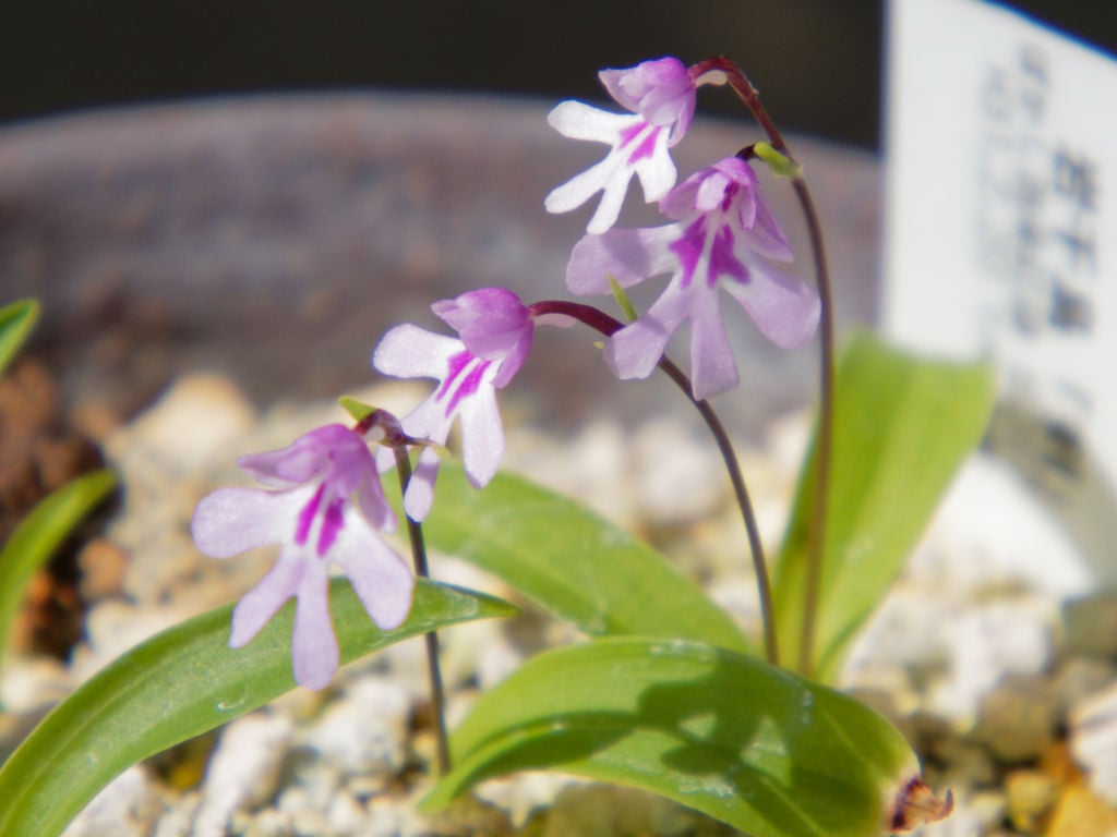 これは岩千鳥の「剣(つるぎ)」という品種で、日本イワチドリ愛好会登録No.287です。日本イワチドリ愛好会は、関西ウチョウラン保存会とともに、昔からイワチドリの品種を登録・保存管理していた団体です。解散してしまったのは残念です。