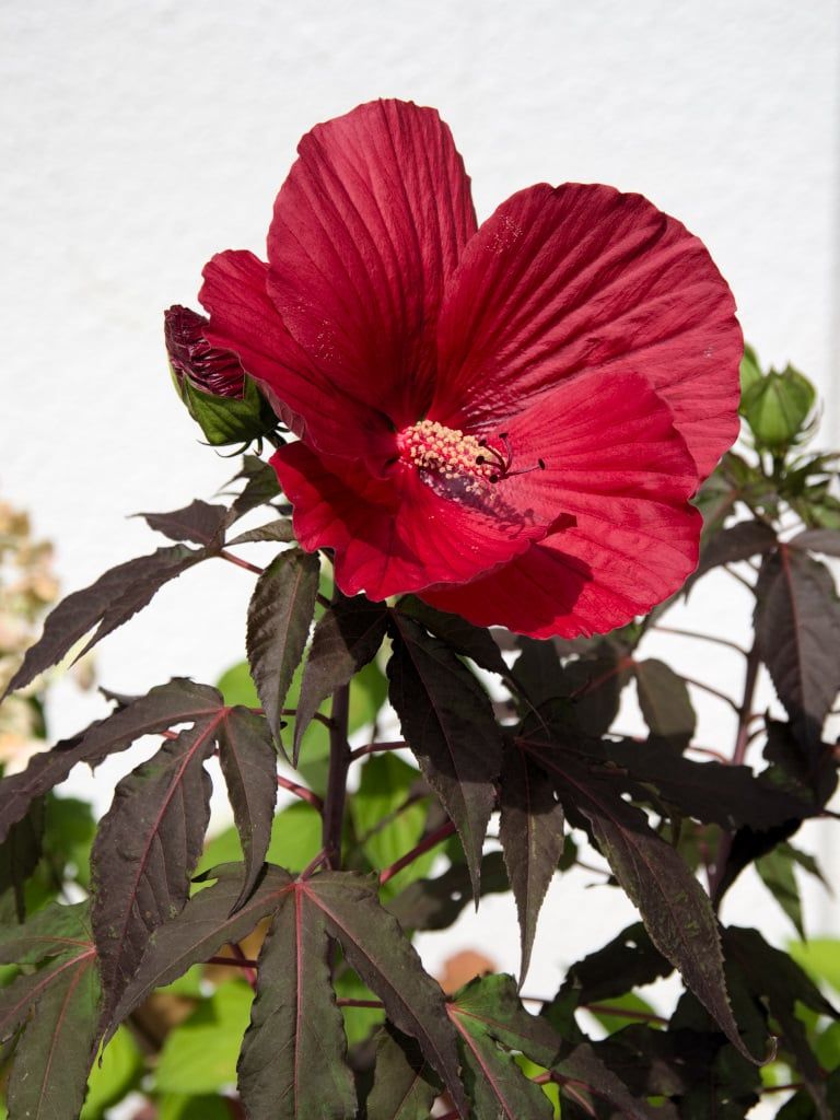 トリトマやホスタと一緒に寄せ植えにしています。去年は花茎が一本だけでしたが、今年は二本出てきたので豪華さも二倍で楽しめそうです。クリムゾンと表現するような濃い紅色がすごくトロピカルフラワーですが、耐寒性の高い宿根草です。