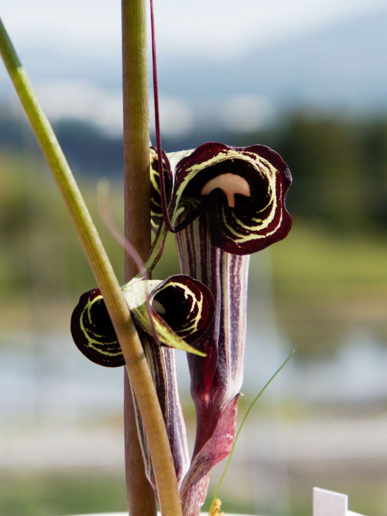 姫浦島草といっても、花が小さいだけで草姿は結構大きくなります。小さく咲いてくれることもあるので、その点はヒメかもしれませんがウラシマソウも割と小さくても咲きますし。