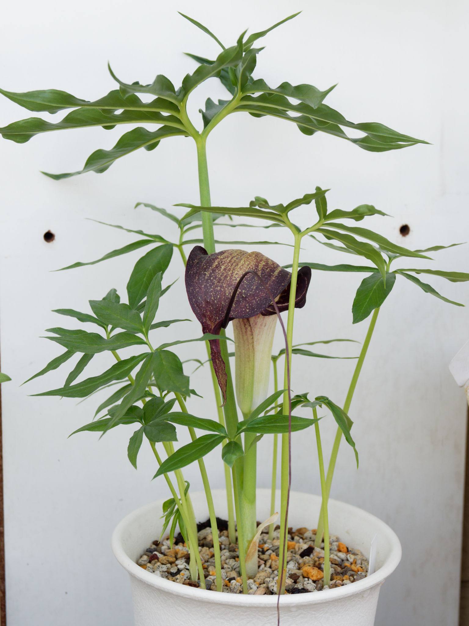 昨年とほぼ変わらない花が咲いた丹心の実生系です。明るい赤に整った花型は良くいえば典型的、悪くいえば平凡なウラシマソウの赤花という感じです。筒の部分の表側が更紗でなくベタ染めになるとかなり印象が変わるので、そういう赤花と交配してみたいと思っています。